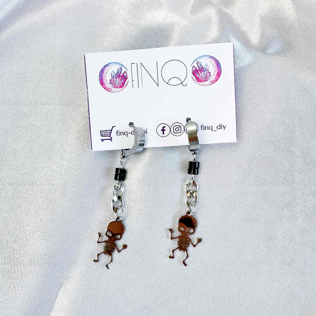 (trochę quirky) Kolczyki z zawieszką w kształcie szkieletora, ozdobione onyksem i kawałkiem łańcuszka. Mają grungowy vibe, trochę trashy.