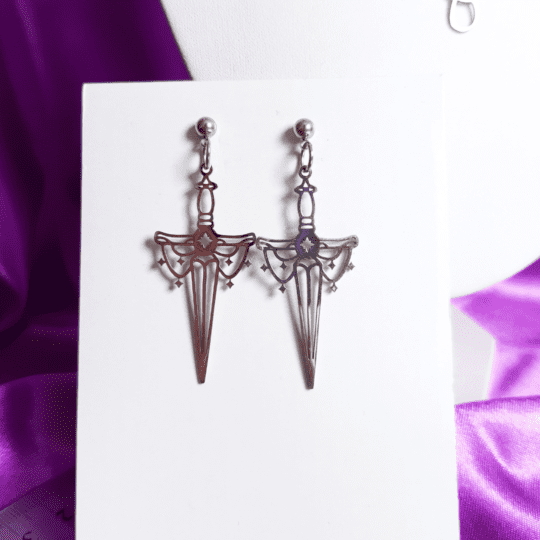 Kolczyki w kształcie bardzo ozdobnych ażurowych sztyletów w kolorze srebrnym. Średnie wielkością, ale nadal delikatne i bardzo lekkie! Długość całego kolczyka wynosi: 6 cm.
