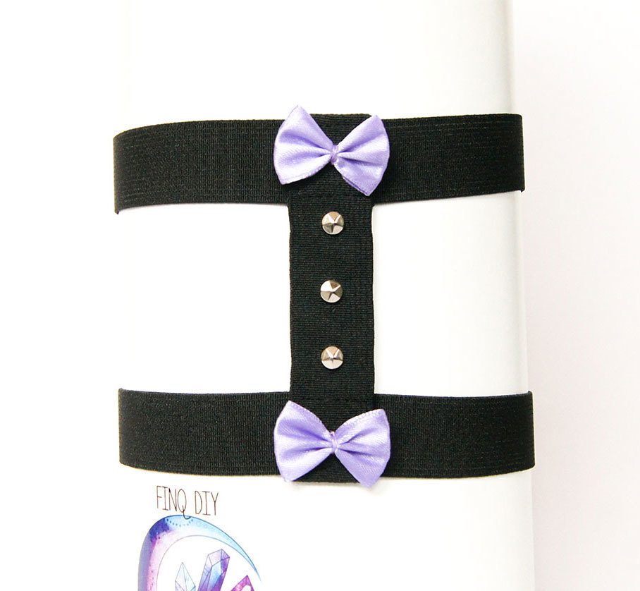 Ozdobiona fioletowymi kokardkami i ćwiekami podwiązka, z dwoma poziomymi paskami. Dwustronna — z tyłu wygląda tak samo jak z przodu. Wykonana z wysokiej jakości gumy o szerokości 2,5 cm. Długość: 11 cm.
