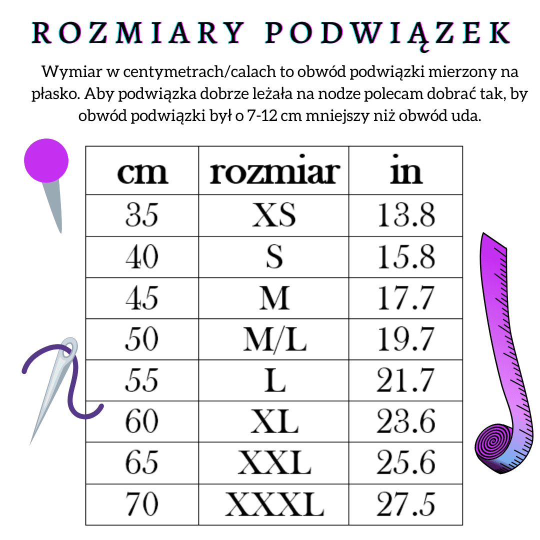 Podwiązka wykonana jest z elastycznej gumy i aby dobrze dobrać rozmiar, należy wybrać podwiązkę o obwodzie 7-12 cm mniejszym niż obwód uda. Obwód uda polecam mierzyć na wysokości, na której podwiązka ma się znajdować (mniej więcej w połowie uda).