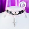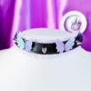 Choker wykonany z paska z ekoskóry, ozdobiony jasno różowymi skrzydełkami, kolcami w kolorze srebrnym (wysokość około 11 mm – niklowane) i jasno rożową falbanką. Na środku chokera znajduje się zawieszka gwiazdka, a po bokach księżyce.